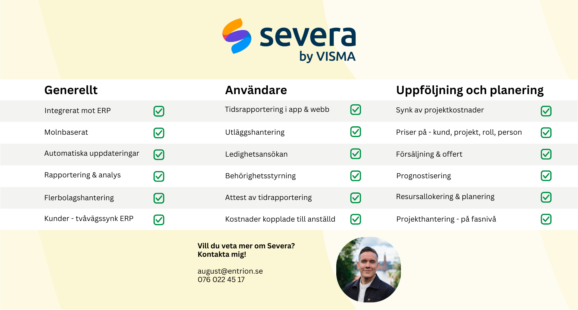 “Entrion har hjälpt oss att effektivisera vår ekonomiavdelning – från tidsrapportering i Severa till fakturering och rapportering i Visma Net. Bytet har verkligen eliminerat många tidstjuvar, och vi kan nu lägga mer energi och fokus på vår verksamhet.”